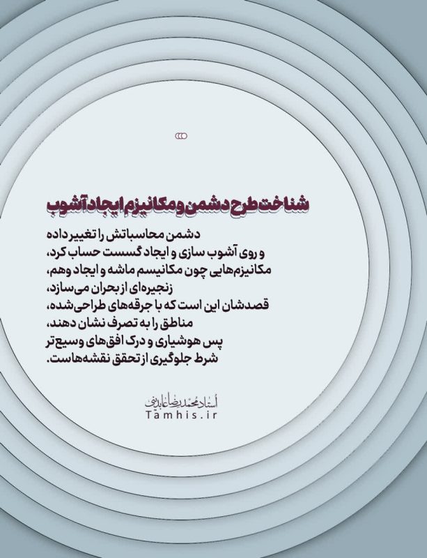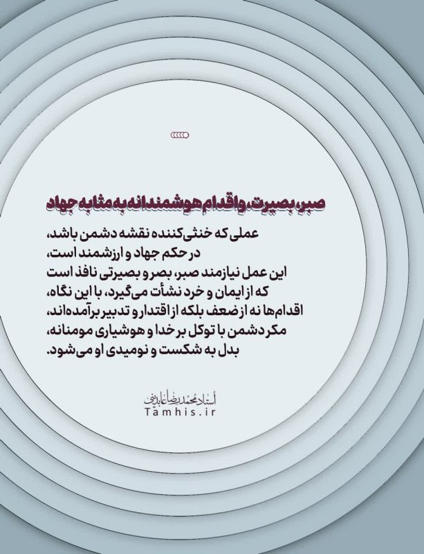 انسجام ملی زیربنای هر مقاومت است، صبر و حلم گاهی از جنگ مستقیم برتر است، دشمن با مکانیسمها و جرقهسازی دنبال گسست و آشوب است، پس هر خیر باید با بصیرت سنجیده شود، آنچه دشمن میپندارد قدرت است، با تدبیر قرآنی و توکل میتواند نقطه ضعف او گردد، عملی که نقشه او را خنثی کند خود جهاد است و راه آینده را با امید و قوت میگشاید.